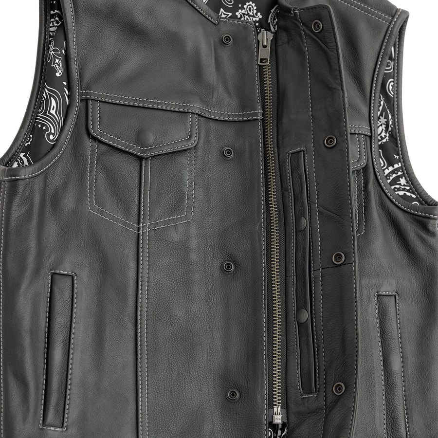 Altimate’s Low Rider White Stitched Leather Vest is made from premium Naked Cowhide Leather, offering exceptional quality and a unique style. The vest is designed to be 2" shorter than other SOA vests, providing better comfort and mobility while riding. This version features bold white stitching, giving it a distinct and striking look. Also available with orange stitching or all black, allowing you to personalize your style.