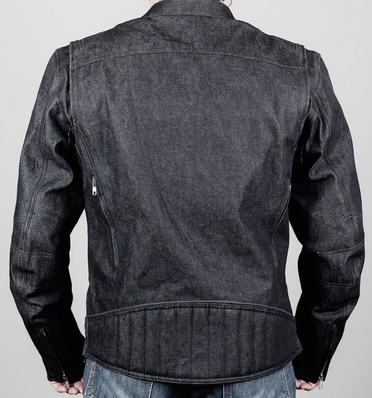This sleek black denim motorcycle jacket blends style and functionality, designed with a café racer influence. It offers robust protection while providing the comfort and style needed for any ride.