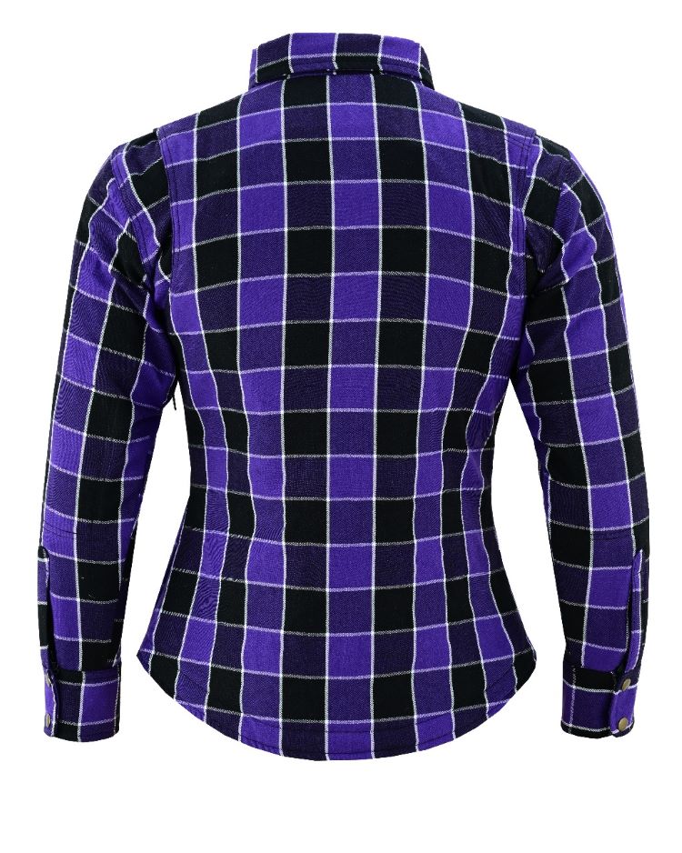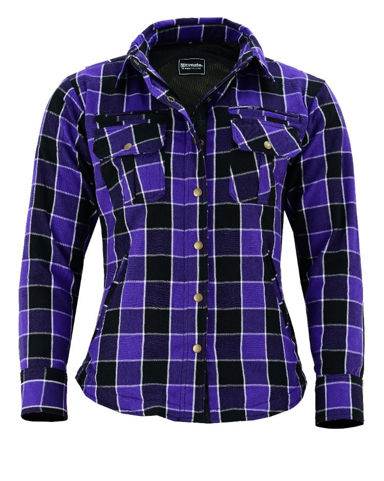 Pair this protective shirt with a stylish leather vest for added flair and extra protection as you ride down the open road. This purple armoured flannel shirt offers both fashion and safety, making it a great choice for any female rider.
